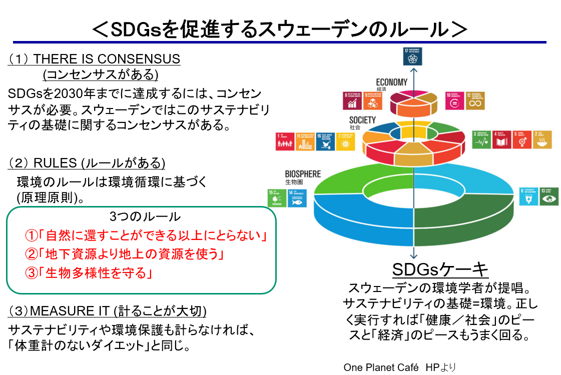 この成功のポイントとして「(1)コンセンサスがある」「(2)ルールがある」「(3)測ることが大切」の3つが紹介されていました。「コンセンサス」や「測ること」としては早い段階からSDGsの理念についてのビジョン(そのうちの一つが図のSDGsケーキ)やその指標が明示されています。ルールとしては「①自然に還すことができる以上にとらない」「②地下資源より地上の資源を使う」「③生物多様性を守る」の3つを明確にし、これらのことをまとめた冊子が全世帯に配られ、初等教育のカリキュラムに導入し国民への浸透を図っているそうです。