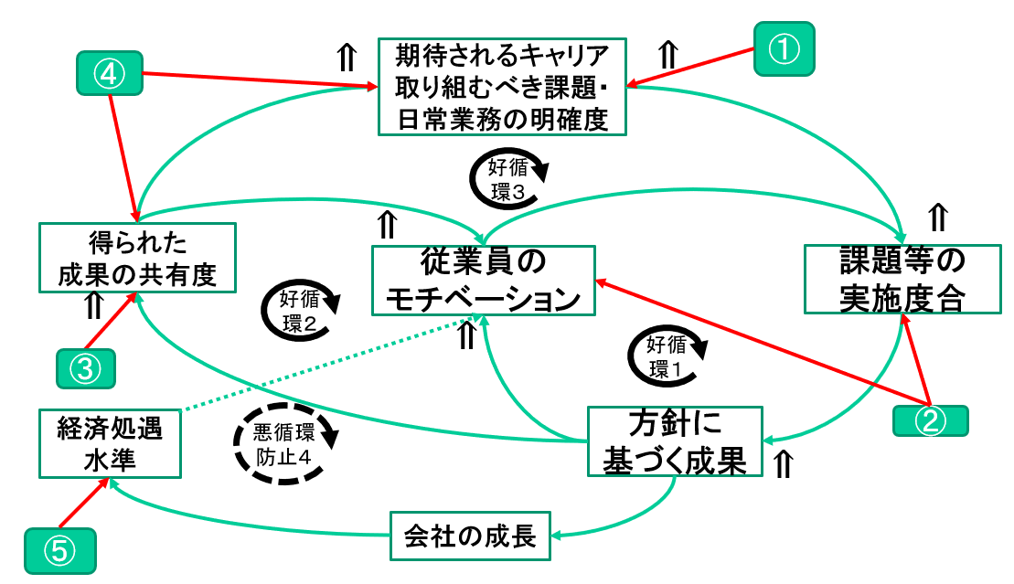「期待される人材像・キャリア・取り組むべき課題・重点となる日常業務の明確度」⇒「課題等の実施度合」⇒「方針に基づく成果」⇒「従業員のモチベーション」⇒「課題等の実施度合」(好循環1)をベースに、「方針に基づく成果」⇒「得られた成果の共有度」⇒「従業員のモチベーション」(好循環2)、「方針に基づく成果」⇒「得られた成果の共有度」⇒「期待される人材像・キャリア・取り組むべき課題・重点となる日常業務の明確度」(好循環3)と二重・三重の好循環でその成長の促進を図っています。