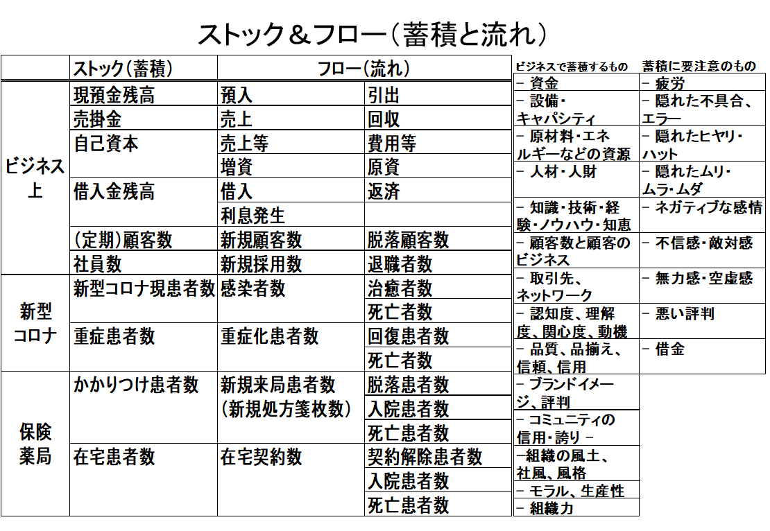 我々はつい、「売上」や「新規顧客数」といったフロー項目に目を奪われることがしばしばあります。(新型コロナの「新規感染者数」もフローにあたります。)しかしながら、フローは、あくまでも期間限定的なものです。これに対し、ストックはその名の通り蓄積するものなので、減少させるフローが増加させるフローを上回らない限り、減少しません。それゆえ、KPIやKGIの設定や戦略策定の際には、ストックの数値を考慮することが重要と言われています。※著名な環境科学者のドネラ・メドウズは1990年代に「(当時)の経済学が実用的ではないのは、ストックの数値を軽視しているからだ」と述べたそうです。あくまでも当時の経済学に対してですが・・・