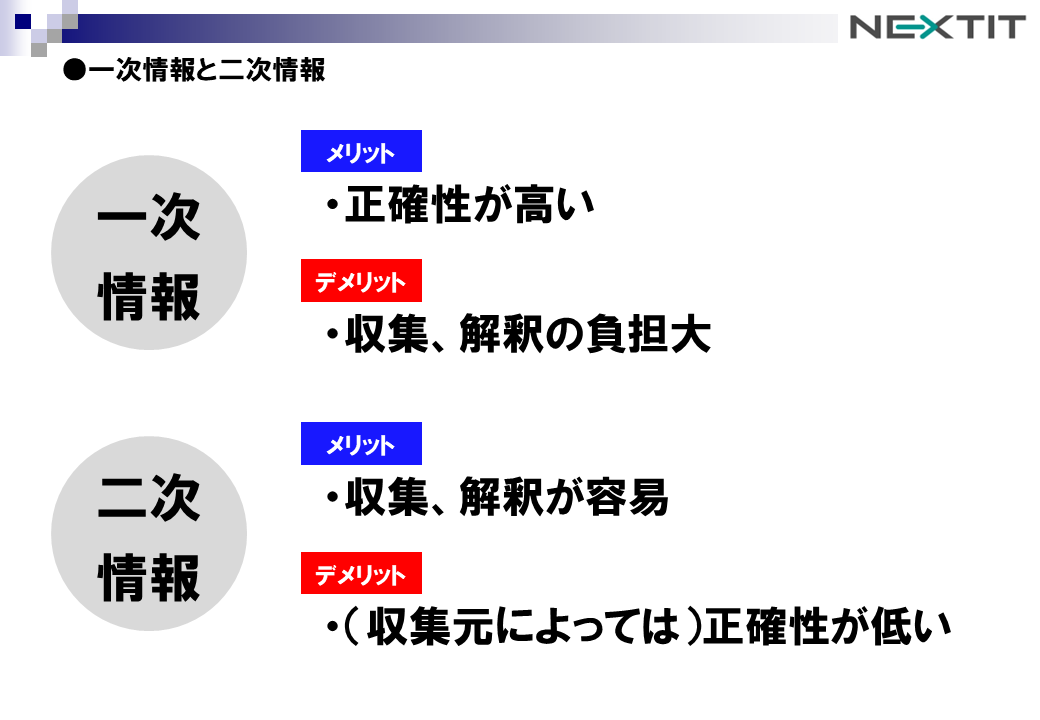二次情報の最大のメリットは、「(情報の)収集、解釈が容易」であることです。情報収集~解釈をある程度既にされていると情報の受け手側の負担は軽減されます。