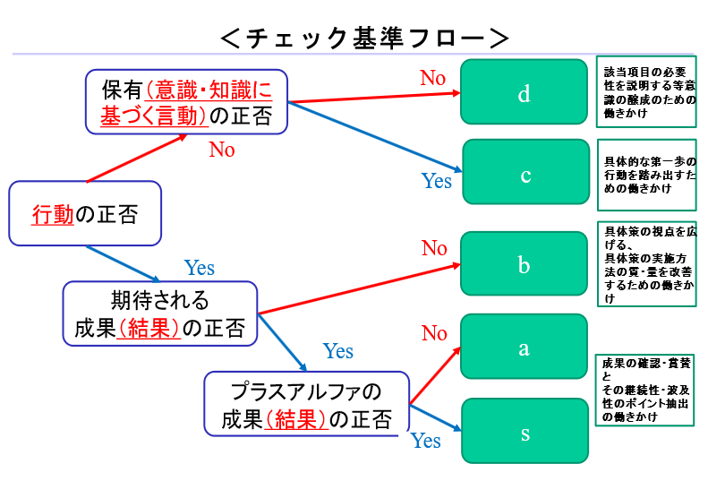 まずは、「行動」がなされているか、を観ていきます。「行動」がなされているのならば、次にその「結果」が得られているか、そして「結果」が得られているのならその継続のためにどうしていくか?と働きかけていきます。もし、「結果」が得られていないのなら「行動」が適切でない可能性が高いので、その見直しに向けて働きかけることが必要です。