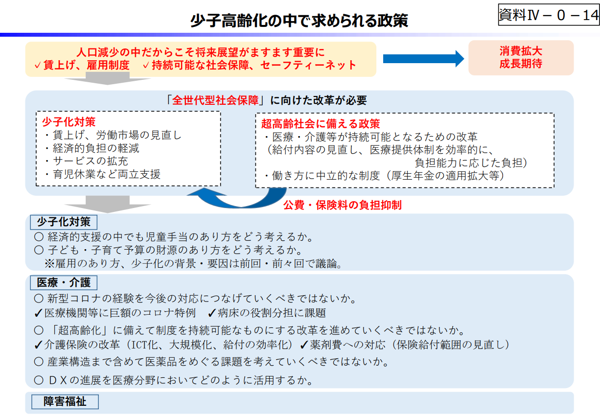 そのため、少子化対策だけでなく、「全世代型」の制度を実現するために、医療・介護の改革議論を加速させる必要があると言及されています。