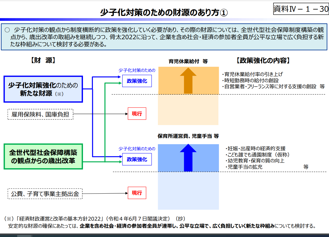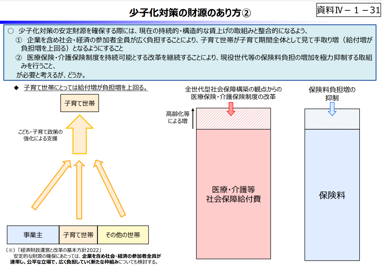 このように、引き続き医療・介護の給費抑制等の歳出改革行いながら、少子化対策にかかる支援の財源を捻出していこうとする姿勢が強く見られます。