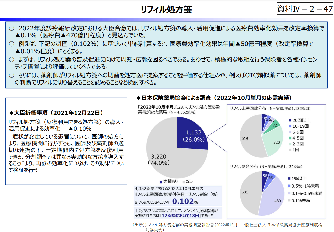 リフィル処方箋については、改定時には医療費効率化効果として、改定率ベースで▲0.1%(医療費▲470億円程度)を見込んでいました。