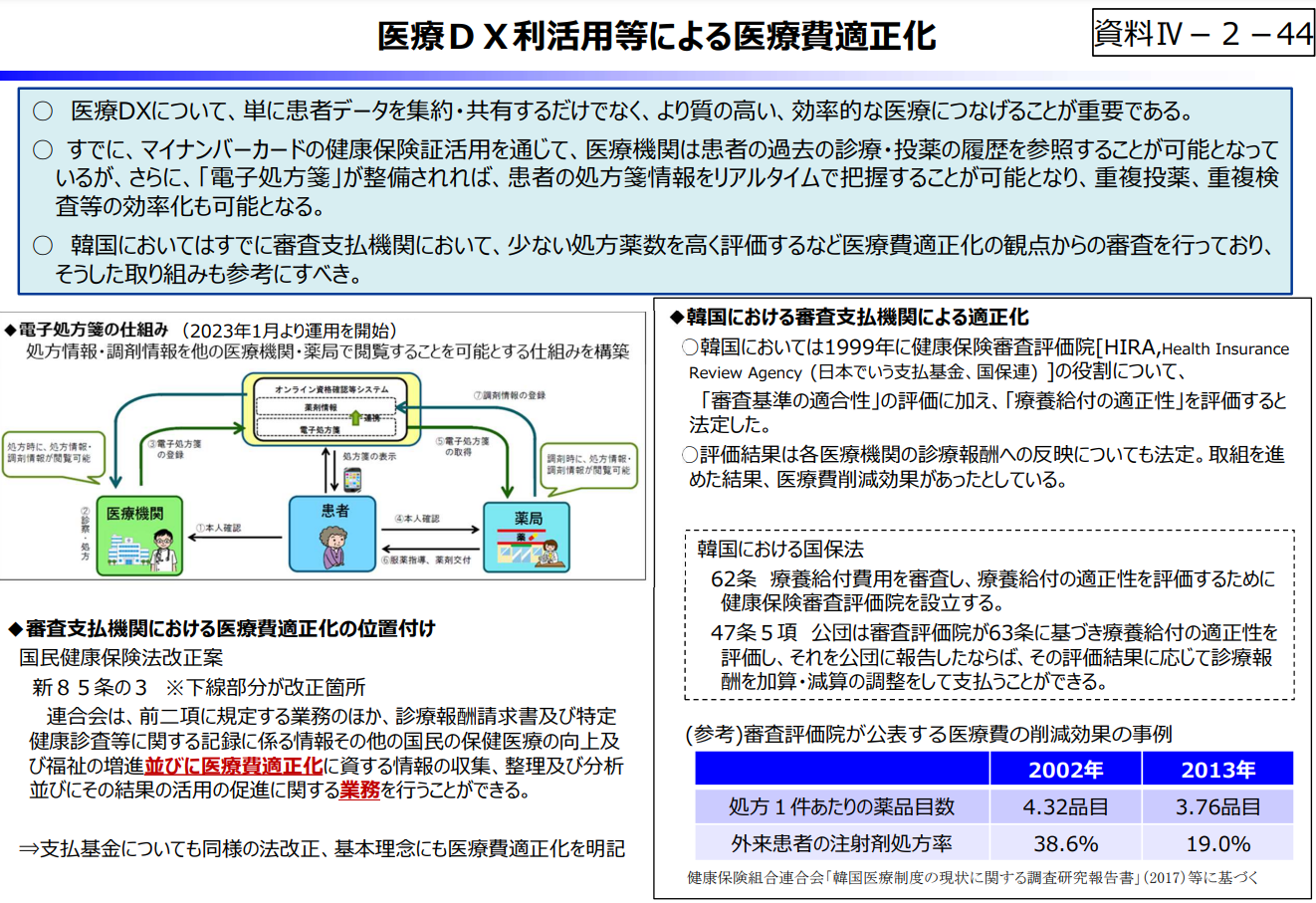 韓国の審査支払機関の例として、「審査基準の適合性」だけでなく「療養給付の適正性」を評価し、その評価結果を診療報酬への反映について法定されている例が示されています。