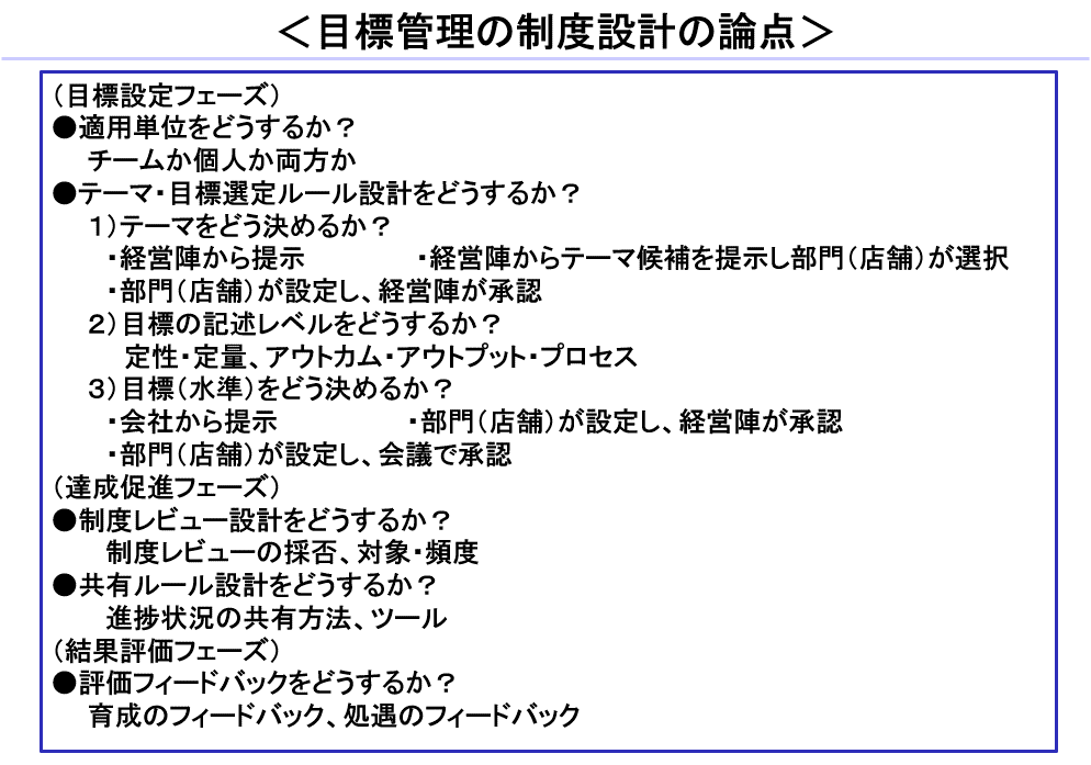 目標管理の目的は、「組織のリーダーが、メンバーに自ら目標を設定することを促し、目標達成のために自律的に仕事を進める風土を醸成し、そのことで組織課題の推進を図ること」なので、この目的に沿うように自組織の状況を踏まえて制度設計をしていくことが重要です。そのために議論しておくべきポイントとして、次の点をお勧めします。