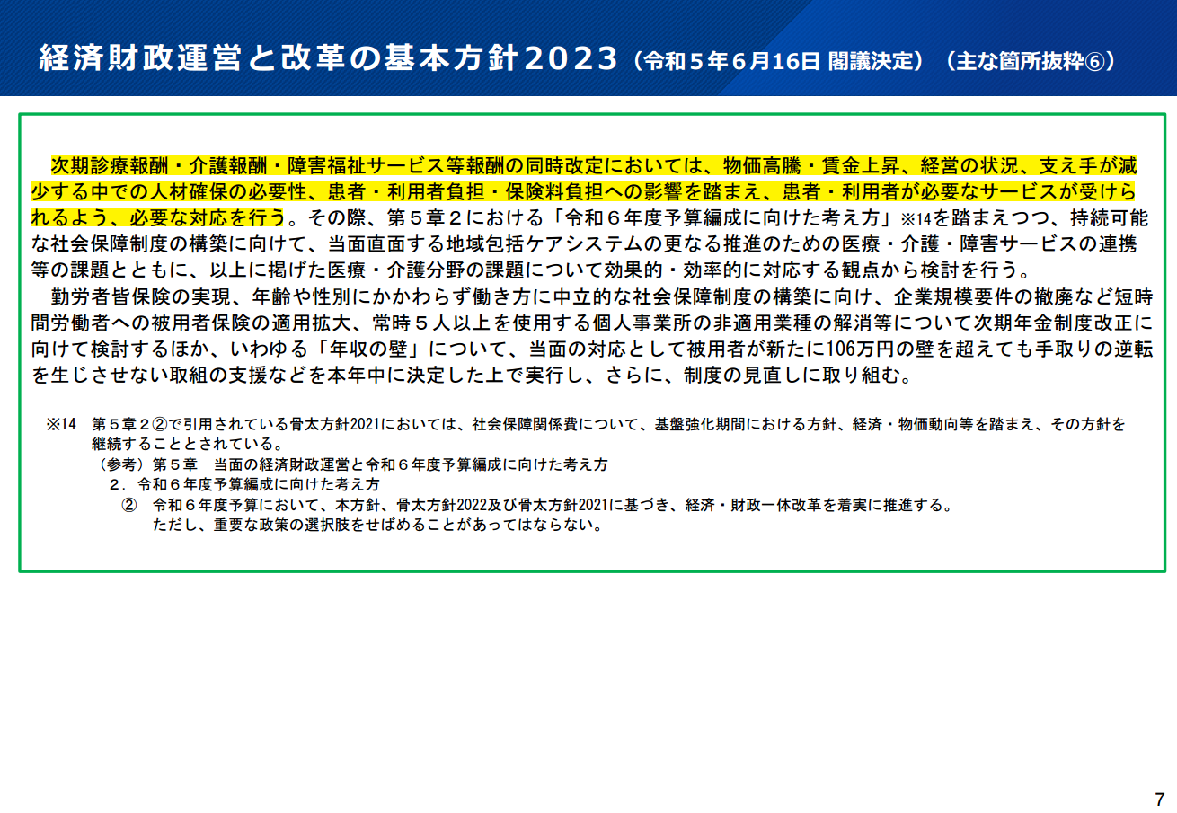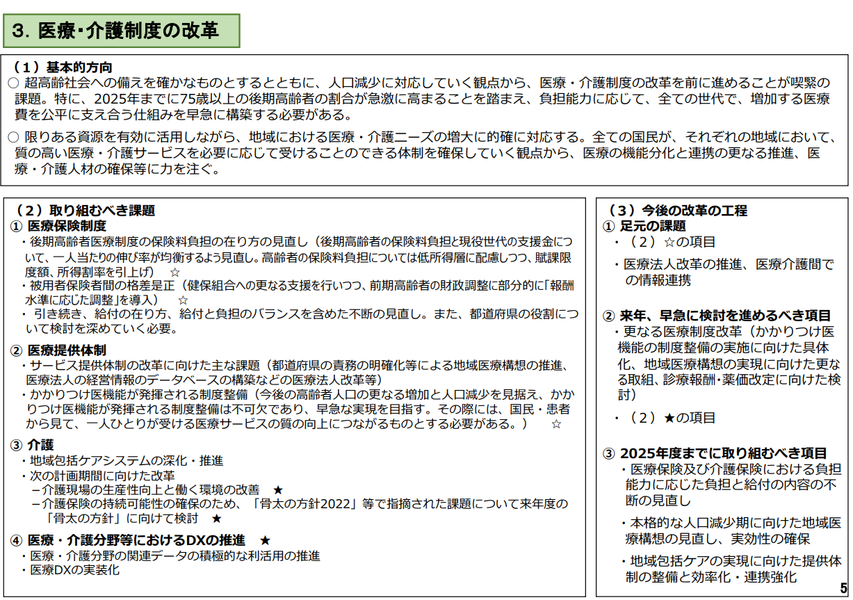 骨太方針の中では、「医療・介護等の不断の改革」「ワイズスペンディングを徹底」といった改革に向けた強い表現がされています。