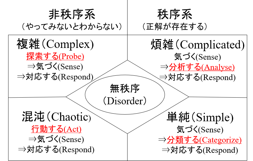 単純(Simple)、煩雑(Complicated)、複雑(Complex)、混乱(Chaotic)、無秩序(Disorder)