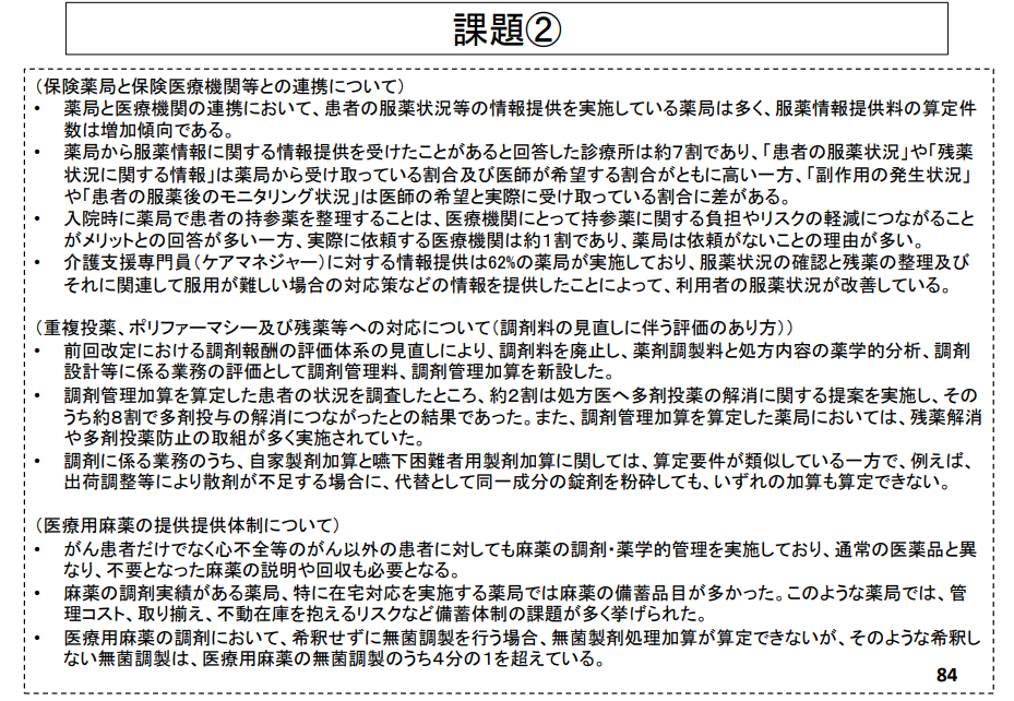 今回は、中医協総会で発表された「調剤(その2)について」の資料を元に、