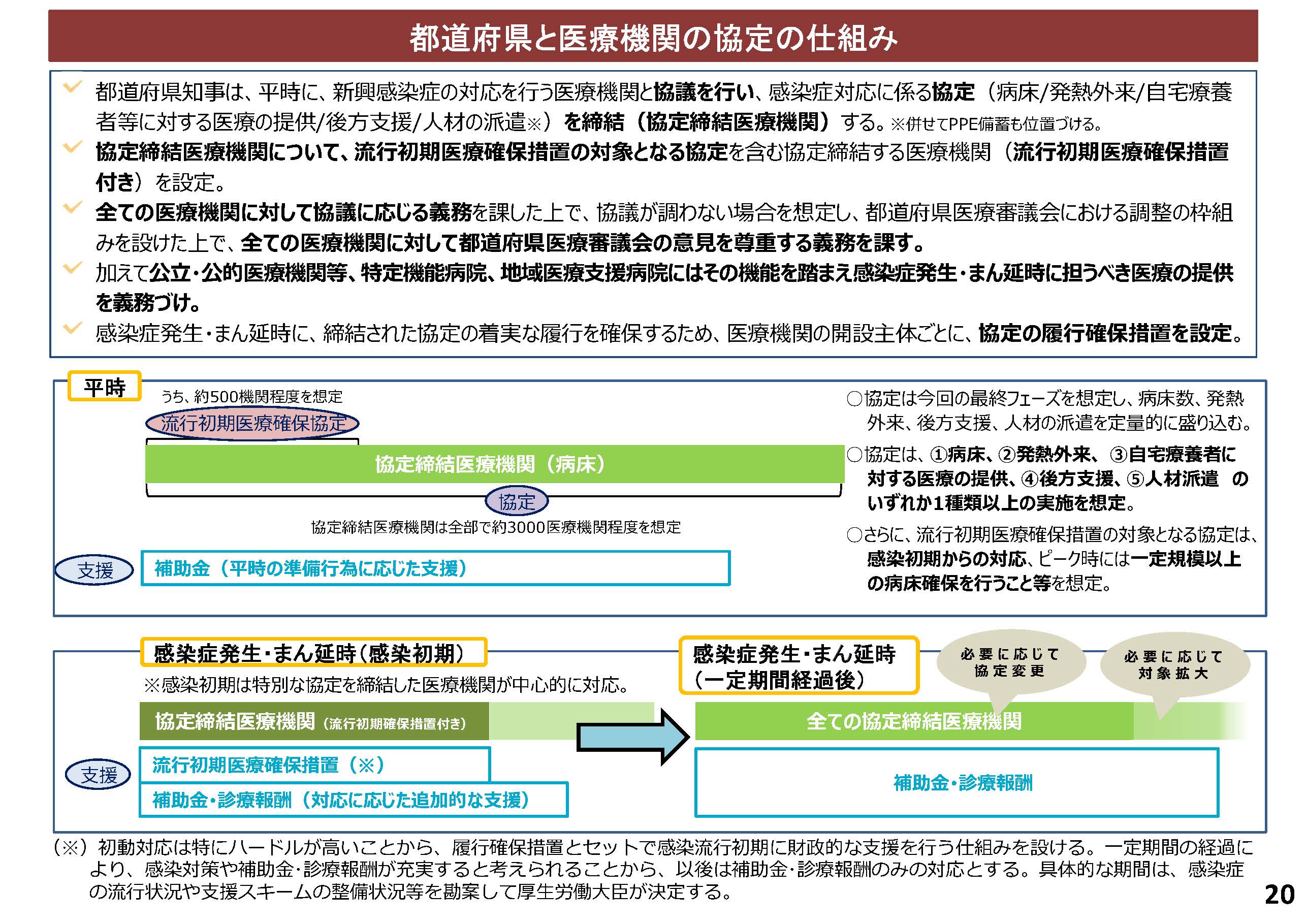 新興感染症等が発生等の有事に早期に医療提供体制を構築するべく、平時から都道府県と医療機関の間で、役割や機能に応じて、対応することを定めた協定を予め締結しておく仕組みです。