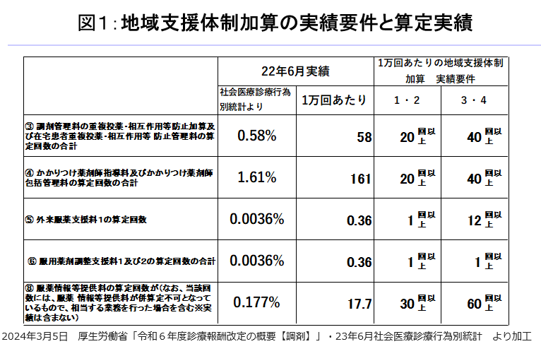これらは、図1のように全国平均算定よりも求められている数値は低く、現場の意識次第でクリアできる可能性が高いと考えています。「重複投薬」は患者のアウトカムに直接つながりやすい項目ですので凡事徹底をすることでモレをなくしていきましょう。
