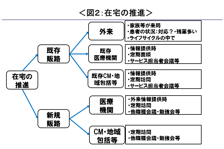 これらについては、地道な活動が不可欠でしょう。在宅の「販路」としては図2のようなものが挙げられ、本部や現場が連携をしてこれらの取り組みをしていくことが重要です。会議への出席は、在宅患者へのアウトカムを高めるためにはサービス担当者会議への出席は貴重な機会と言えます。ケア・マネージャーとの関係性を構築し、年1回は個々の患者について会議参加することは重要ではないでしょうか?