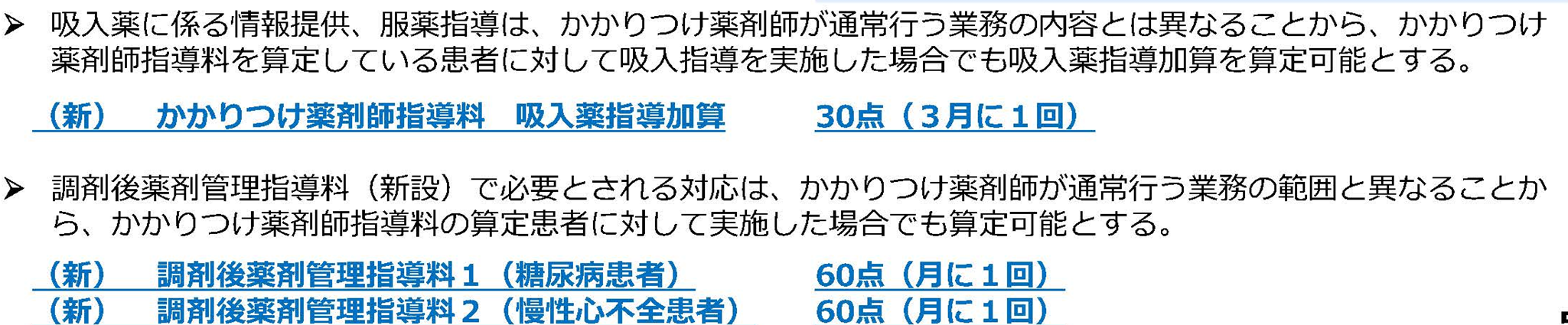 そのような背景もあり、本改定で「吸入薬指導加算」「調剤後薬剤管理指導料」が併算定可へ変更されることになりました。