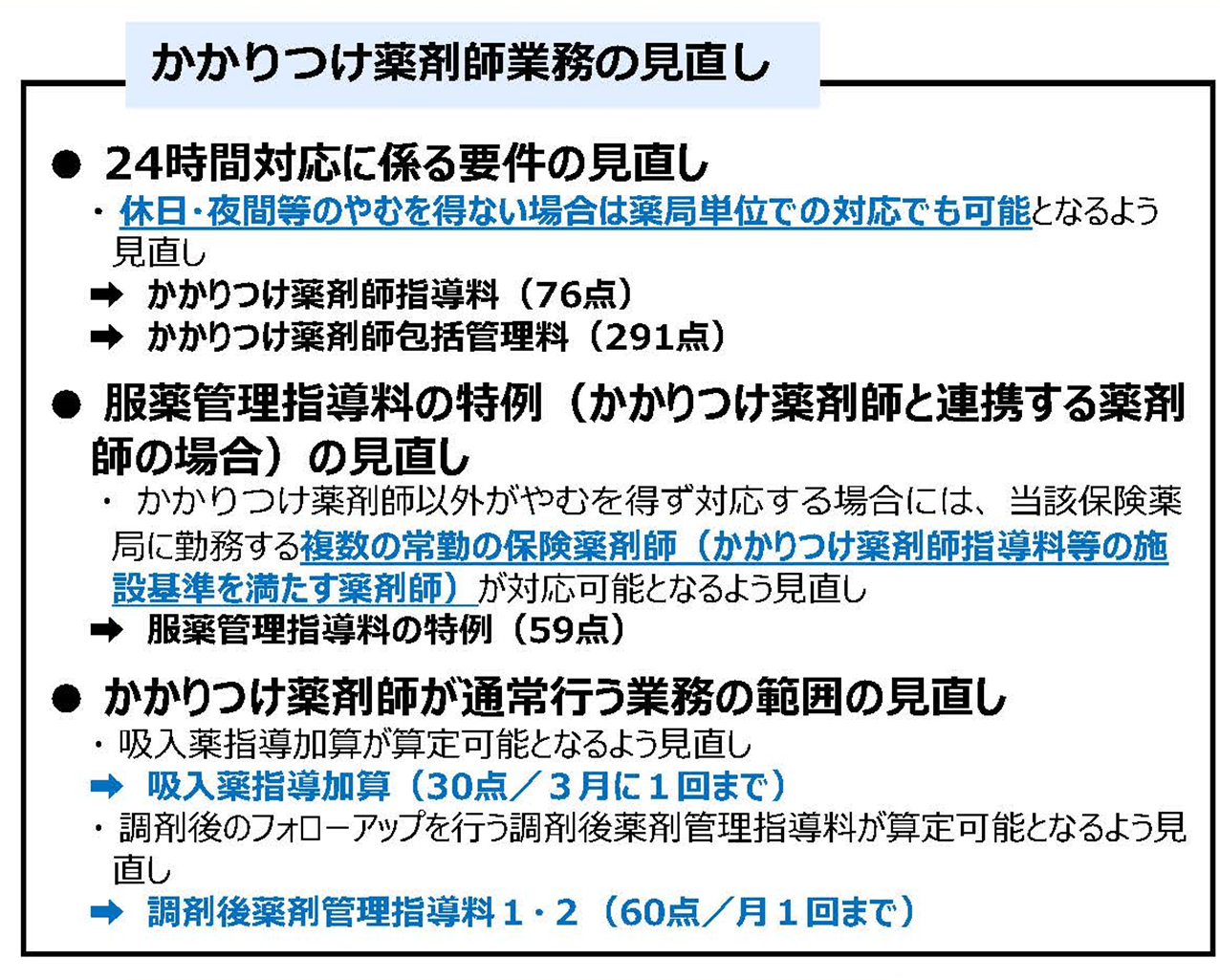 これらの背景から、本改定ではかかりつけ薬剤師業務における負担感軽減と評価の拡充を図るために次の見直しが行われました。