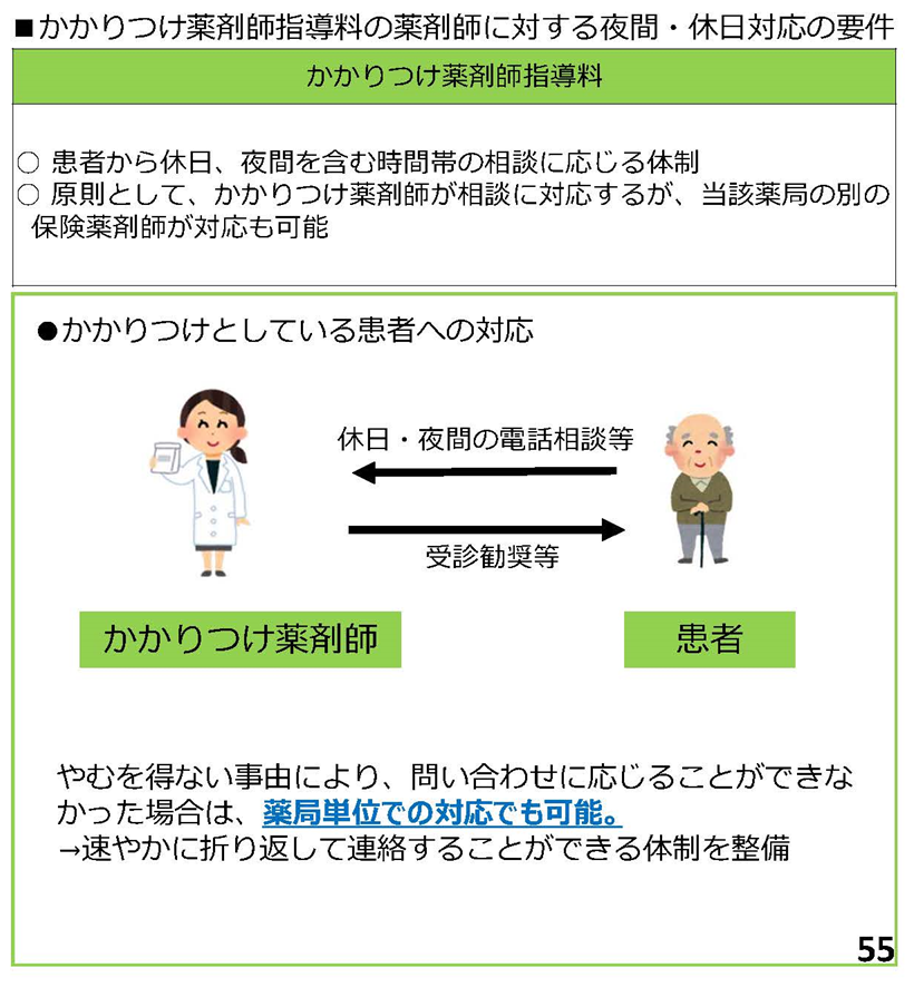 明確に常時電話が取れるよう待機することを求めていないことが示されたことにより、かかりつけ薬剤師への心理的負担を軽減できると考えられます。
