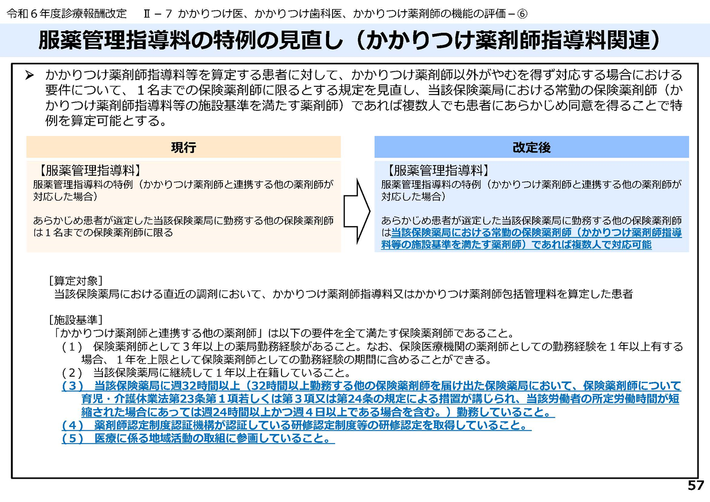 - 服薬管理指導料の特例(かかりつけ薬剤師と連携する薬剤師の場合)の見直し