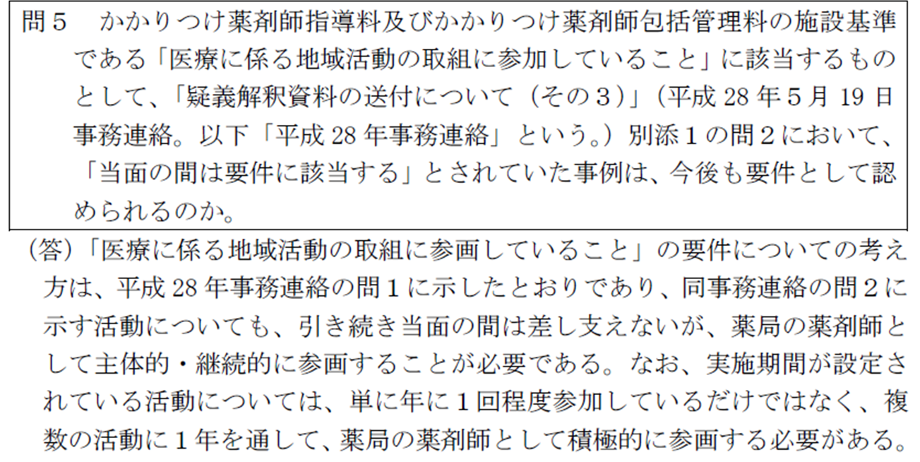 本改定にて改定されていない点ではあるものの、かかりつけ薬剤師指導料の届け出に求められる「医療に係る地域活動の取組」に関する疑義解釈が発表されています。