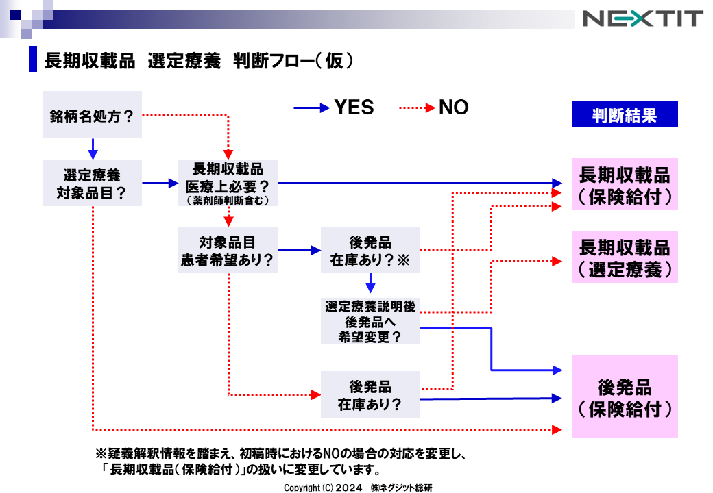 そのため、前述のフローチャート上では、患者希望を優先し後発医薬品在庫がないケースは「保険給付対象」「選定療養対象」としています。