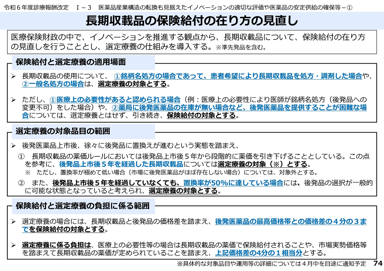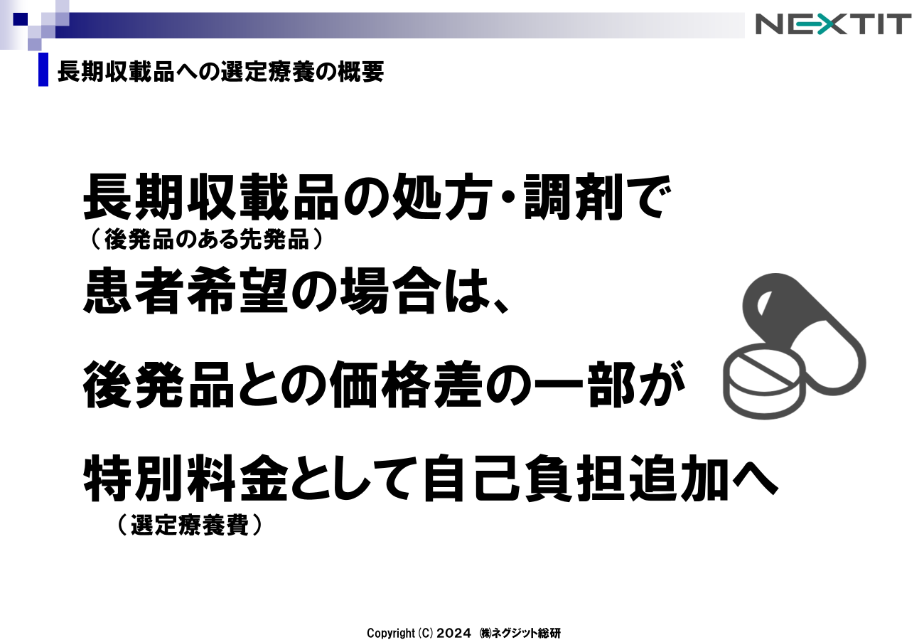 令和6年度診療報酬改定において、長期収載品に選定療養の仕組みを導入する方針が示され、施行が2024年10月からとしています。
