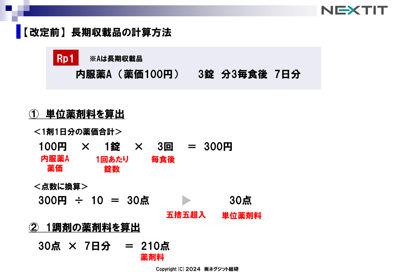 まず最初に当該処方における単位薬剤料(点数)を計算します。