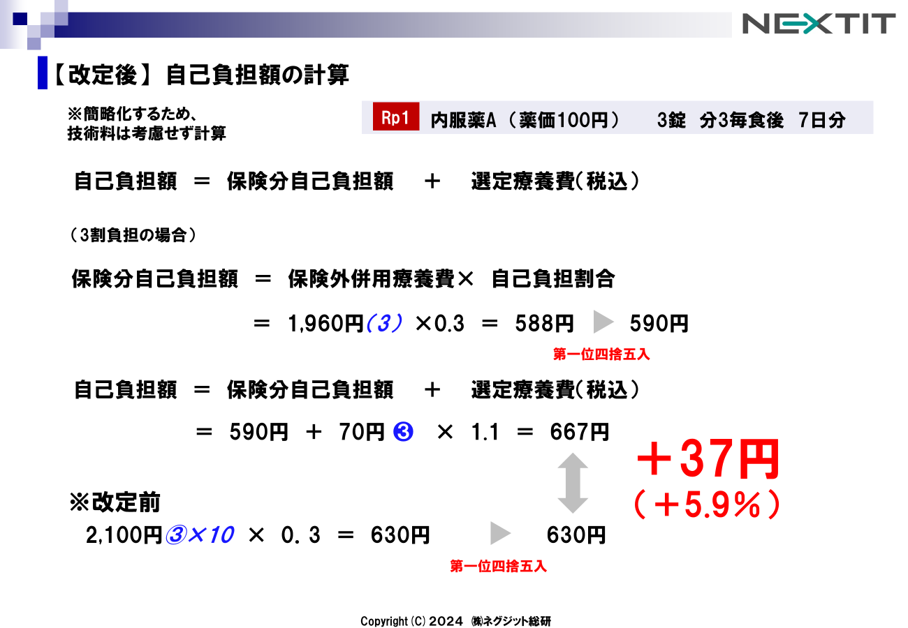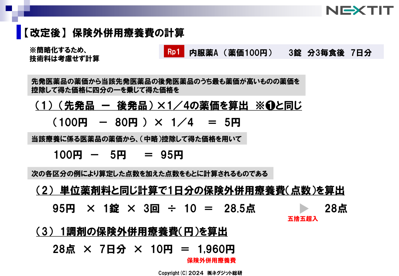 結果として算出された5円を、内服薬Aの薬価100円から控除し、95円が結果として算出します。