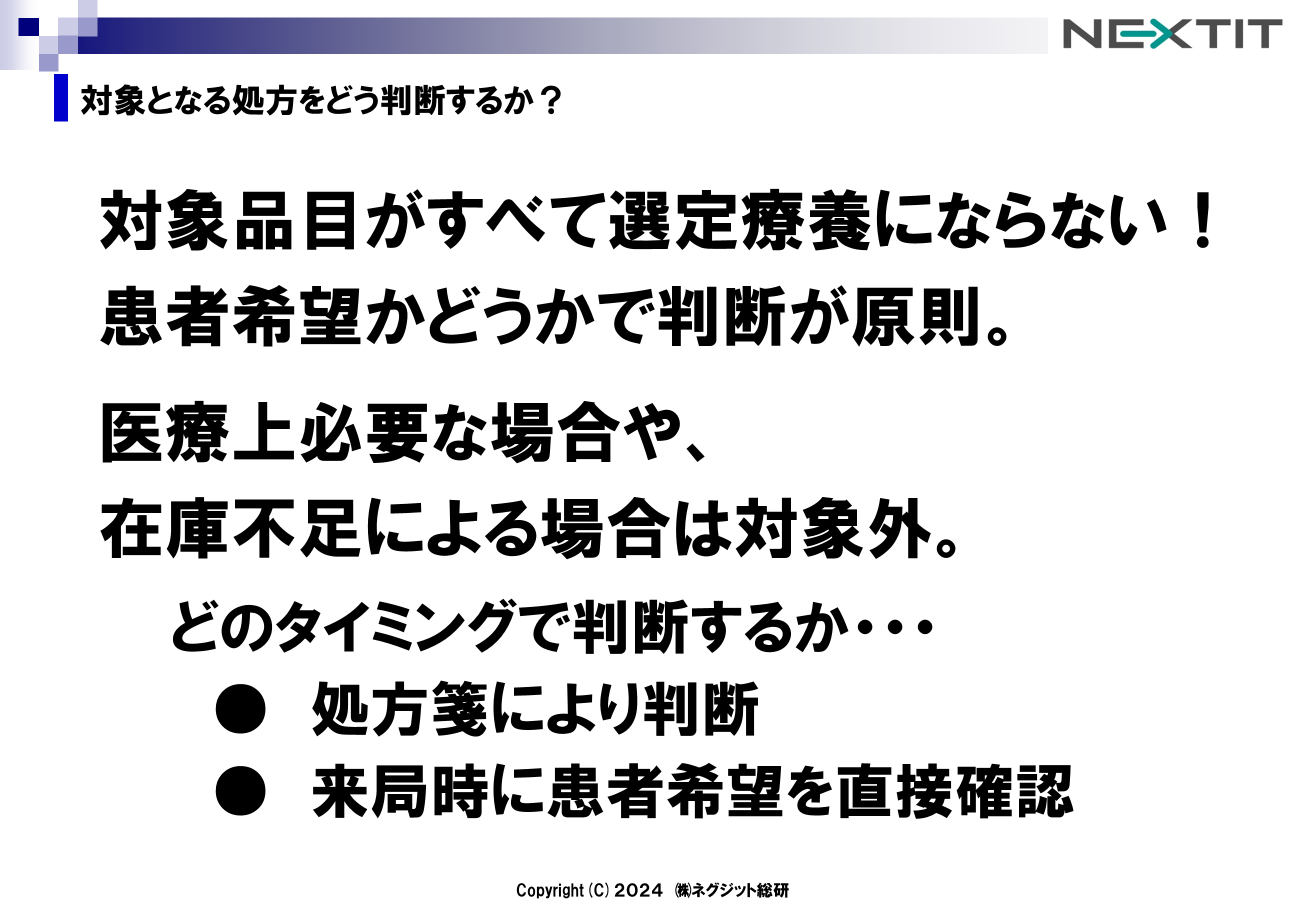 患者希望の確認が求められるため、処方箋応需時に処方箋の患者希望欄の確認や、患者への直接希望確認により選定療養対象かどうかを都度判断しなければなりません。