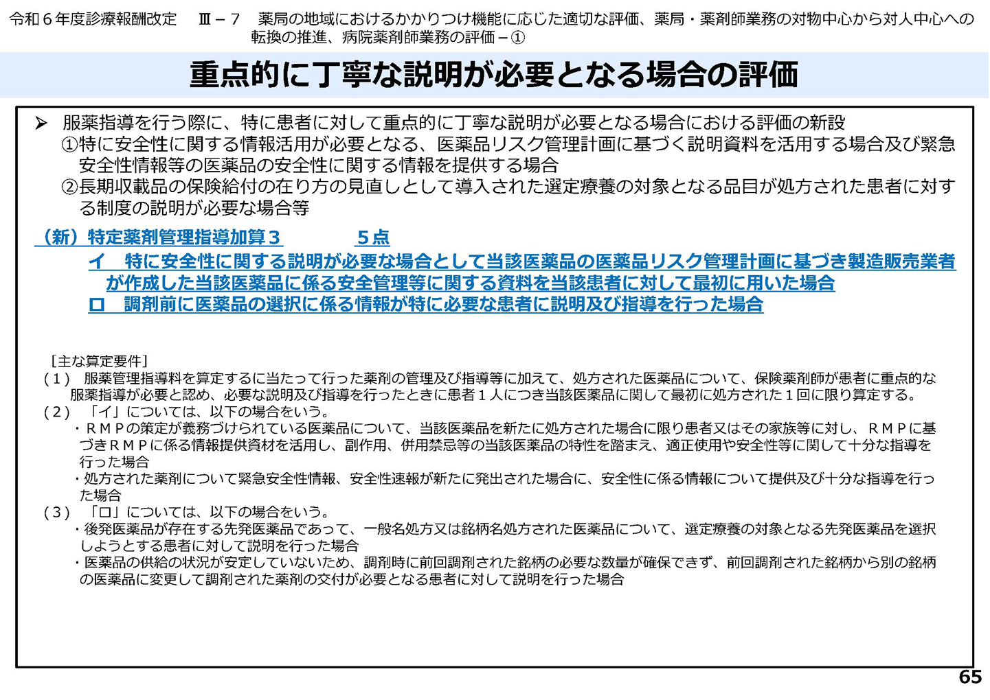 長期収載品の選定療養に関する説明は、「特定薬剤管理指導加算3・ロ(5点)」で評価されています。