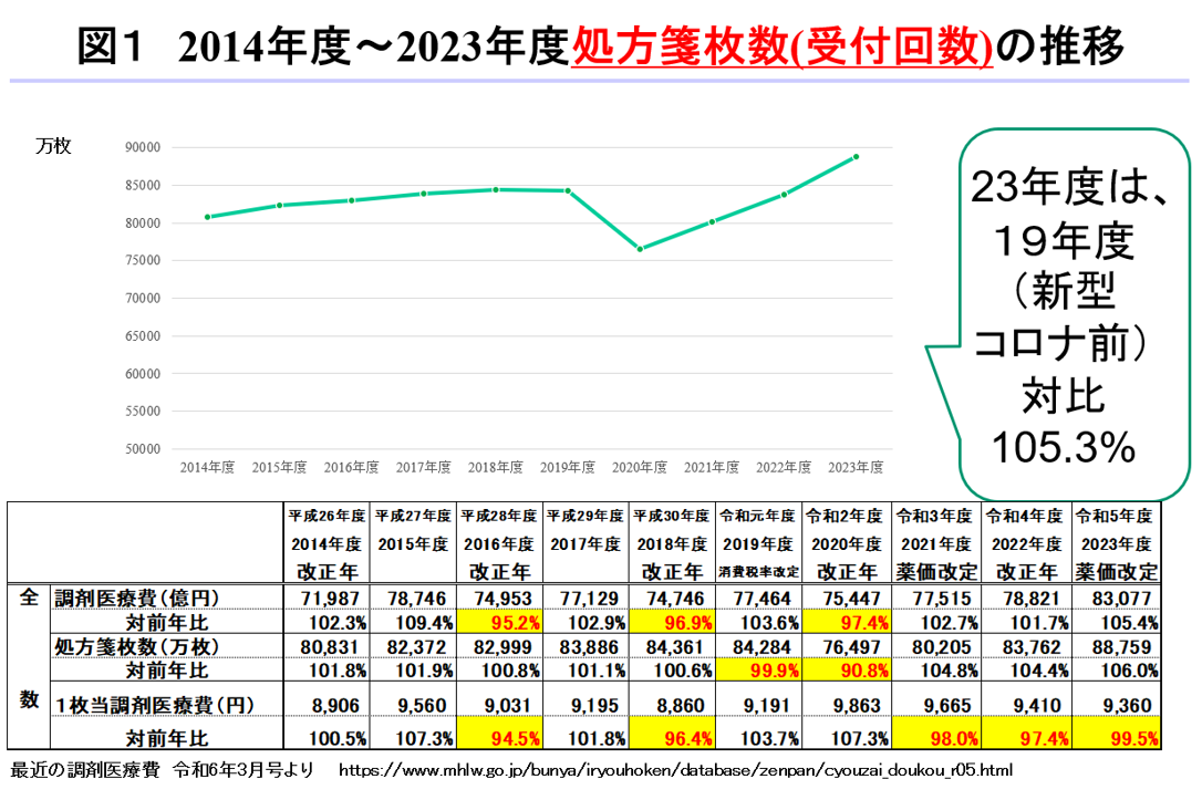 令和5年度(23年度)は、処方箋枚数も8.8億枚と新型コロナ前の水準(19年度)を上回り過去最高となっています。新型コロナ前は、微増傾向が続く中、19年度に対前年をわずかに下回ることとなり、それが新型コロナ感染で加速し、20年度に前年比90.8%と大きく減少させますが、22年度に反転をし、23年度には対新型コロナ前(19年度)105.3%となりました。23年度の増加は新型コロナの5類移行、季節性インフルエンザの流行の増加がその理由として考えられています。
