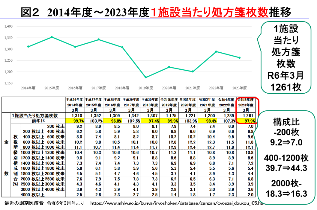 これに対し、1施設(店舗)当たりの処方箋受付枚数は違ったトレンドです。(図2)