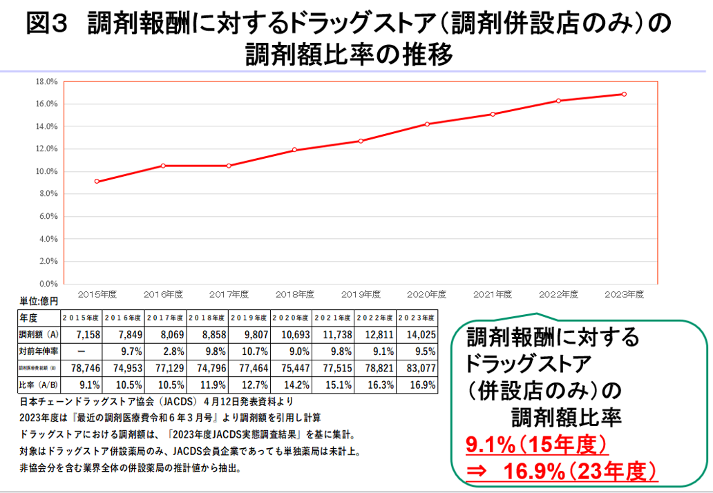 図3は日本チェーンドラッグストア協会(JACDS)が発表したドラッグストアの調剤併設店で応需された調剤報酬額を調剤報酬総額に対する比率の推移を示したものです。これを見ると15年度9.1ポイントから23年度16.9ポイントと7.8ポイント増えていることがわかります。調剤併設店ですと1施設当たり処方箋枚数は1000枚前後の店舗が多いと考えられていますので、前述の内容を裏付けるものと言えるでしょう。