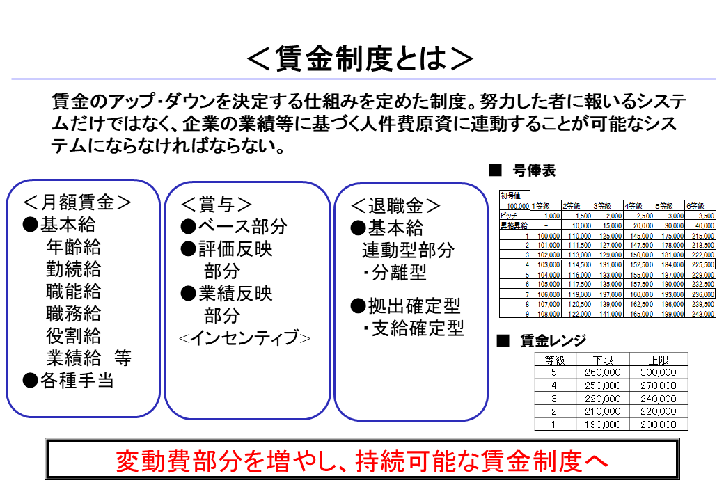 「やったもの」に報いる賃金制度を導入するにはこの部分をいかに確保するかにかかっています。環境変化の大きい時代において「やったもの」というのも、今年「やってくれた人材」が来年も「やってくれる」という保証はなく、一度上げればそれが既得権的になりやすい固定費賃金ではその変化に対応できないからです。