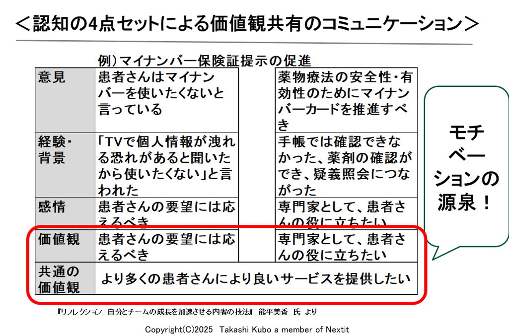 異なる意見や感情がある中でも、共通のゴール(例:患者さんにとっての最善やより良いサービスの提供)を軸に、全員が共感できる価値観へと対話を促します。