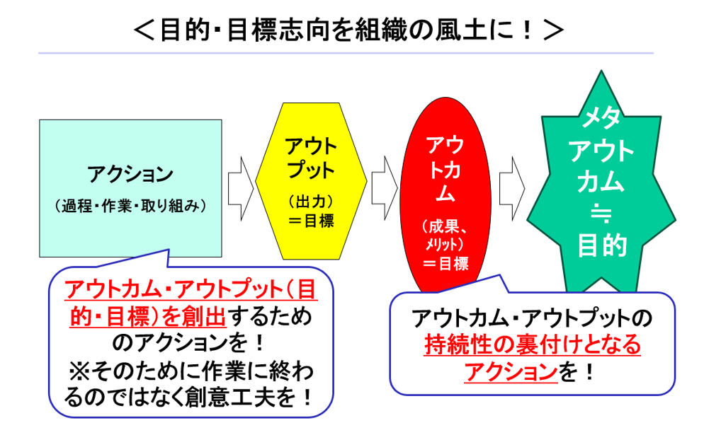 目的・目標を明確にし、共有することは、仕事の成否の判断、進捗の確認、業務改善・革新の指針となります。組織として、目的・目標を明示し、定期的に確認する習慣を持ち、組織風土としていくことをおすすめします。その第一歩として、新入社員を迎える機会を活用してみてはいかがでしょうか。