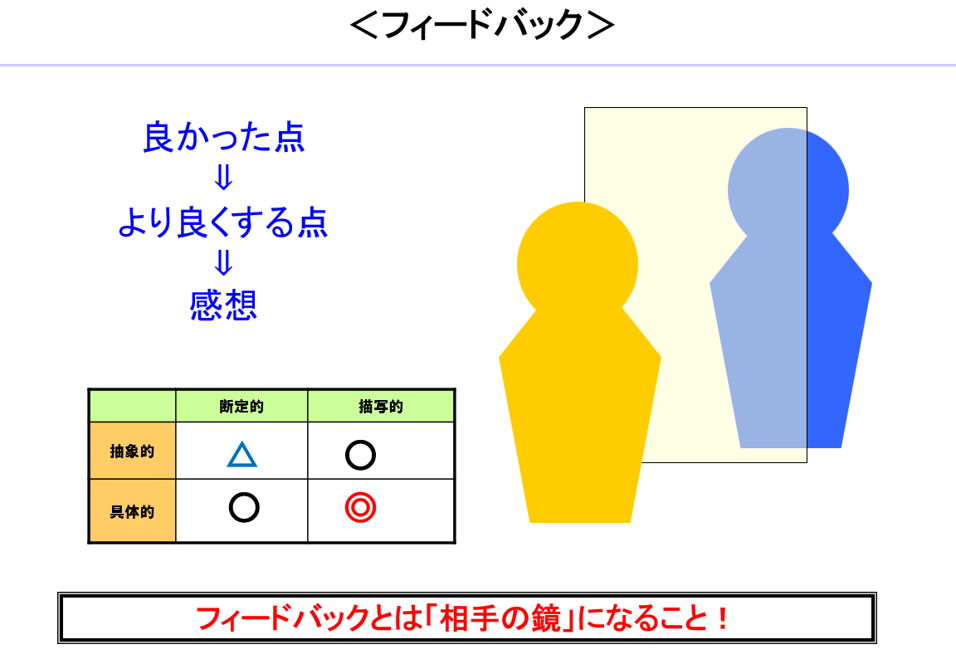 フィードバックとは、「他人の目を通した成長のための鏡」(立教大学 中原淳教授)です。相手の行動が「他者からどう見えているのか」を伝えることで、その人自身の気づき・改善・成長につなげることができます。