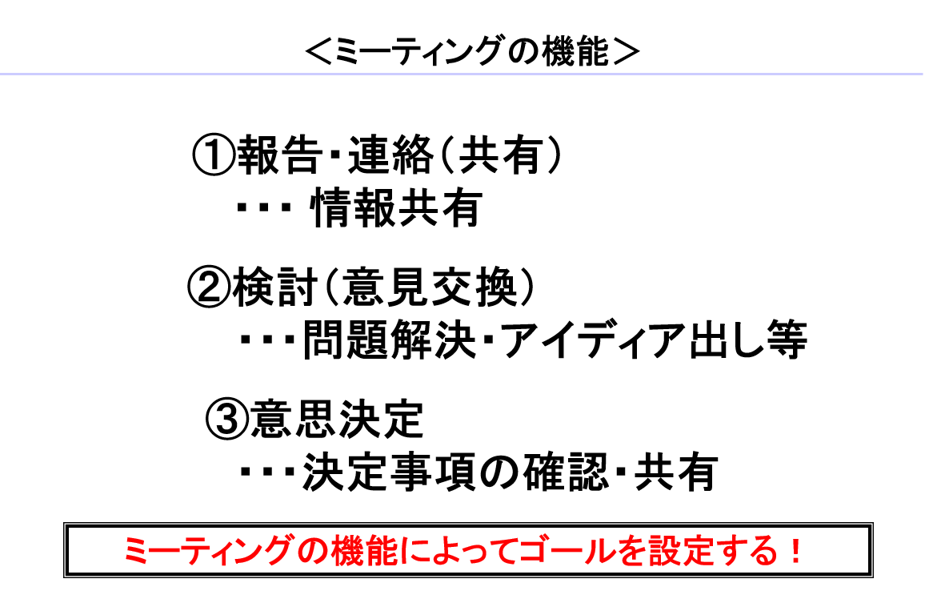 まず重要なのは、「この議題は、ミーティング終了時にどうなっていれば成功といえるか?」というゴール設定です。一口に議題といっても、以下のようなタイプに分けられます。