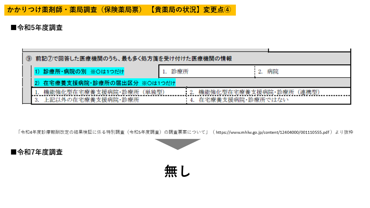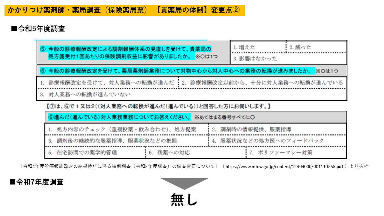 今回の調査では、「かかりつけ薬剤師に関する取組」の設問項目に変更は見られません。設問構成や内容は令和5年度調査を踏襲しており、評価の視点や調査対象の範囲も同様です。