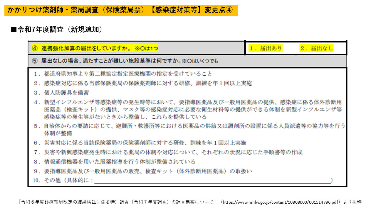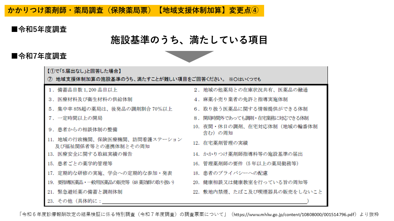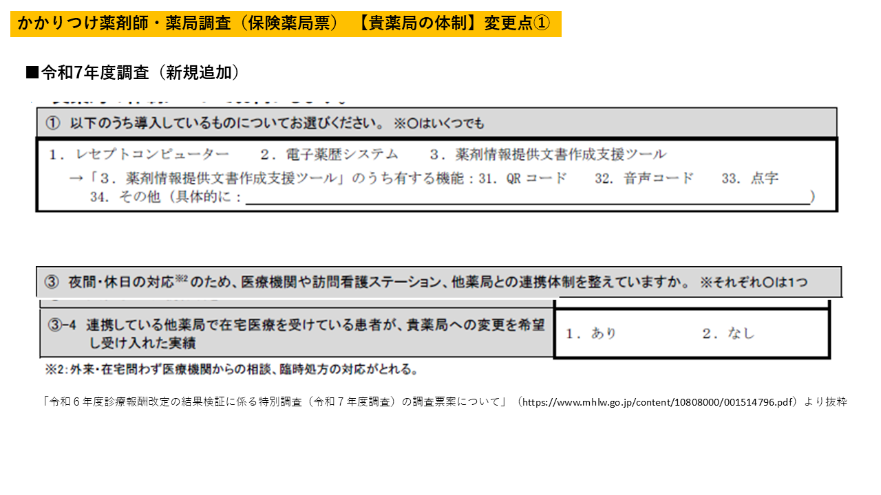 さらに、夜間・休日対応のために医療機関や訪問看護ステーション、他薬局と連携体制を整えているかどうかを問う設問も追加されました。こうした連携は、緊急時の対応力や地域包括ケアの一翼を担う上で欠かせない要素です。今回の設問追加は、薬局の内部体制と外部連携の両面から現状を可視化し、将来的な評価や制度設計に活かす狙いがあると考えられます。