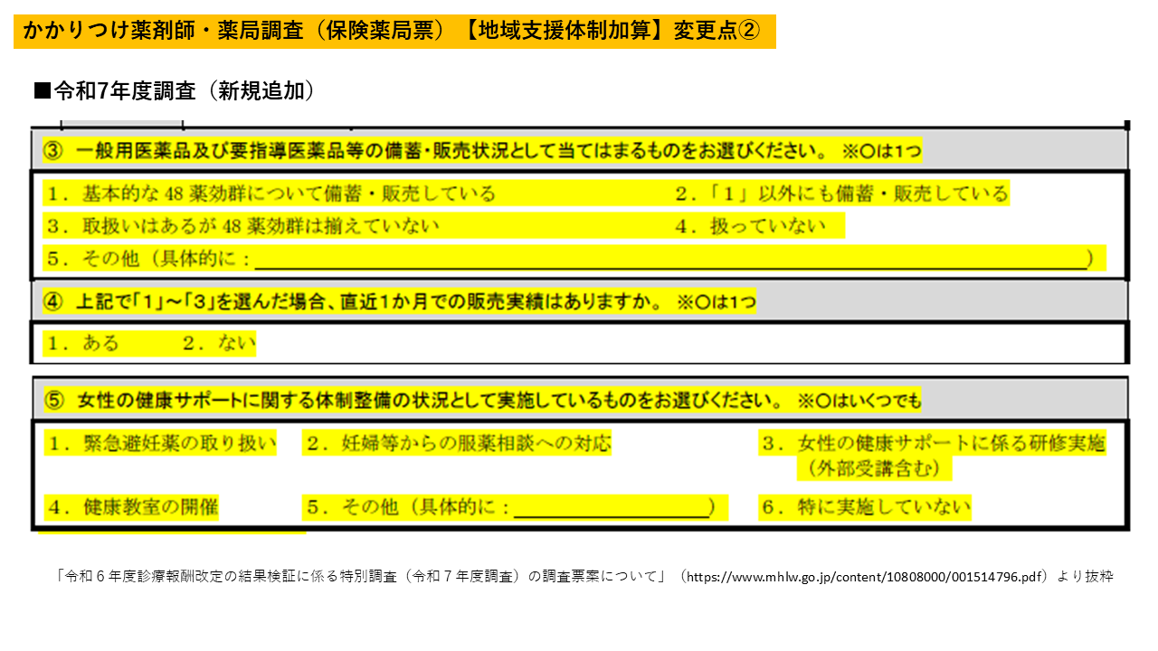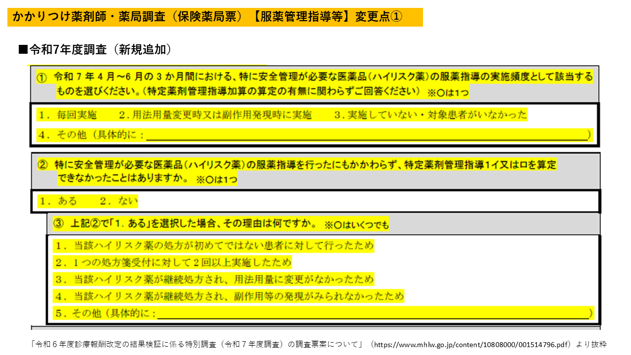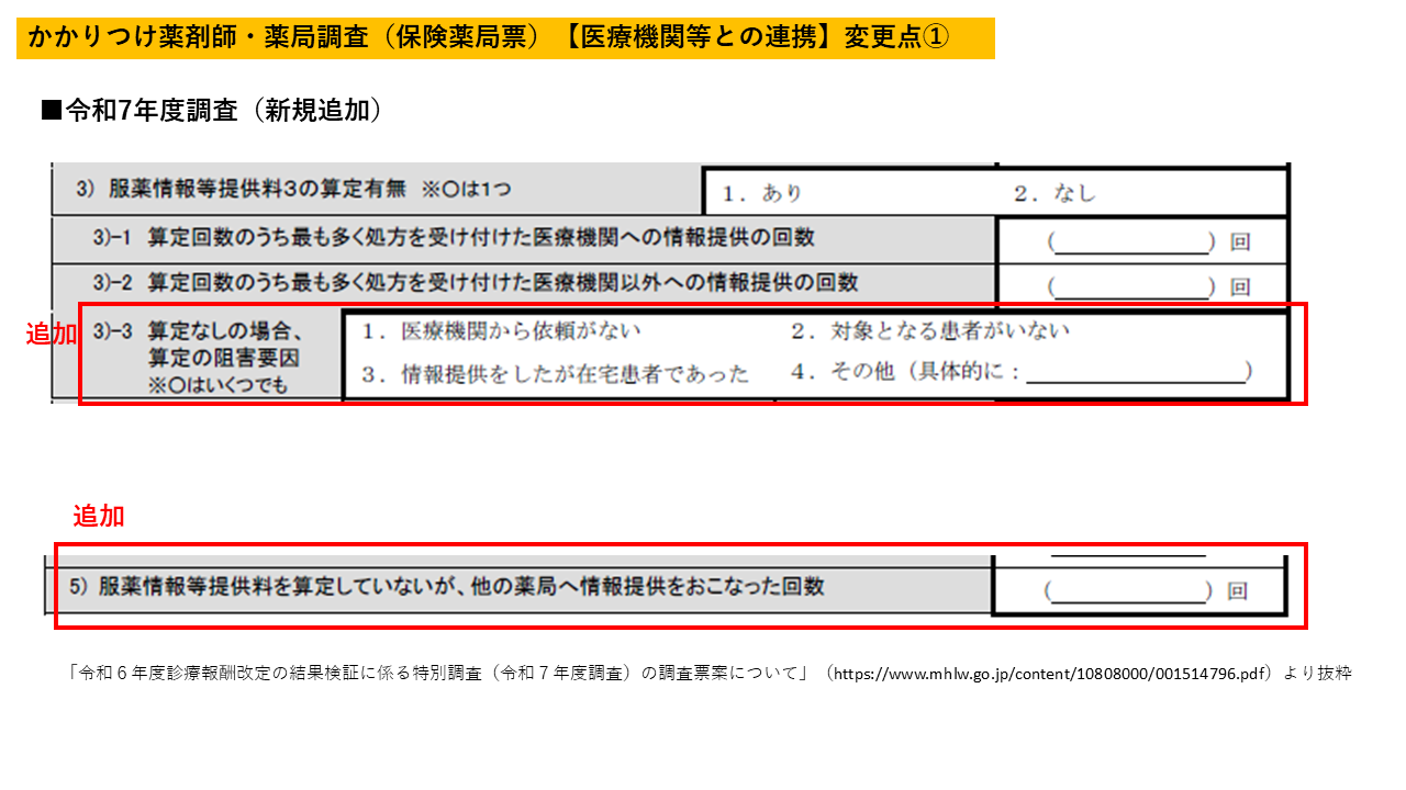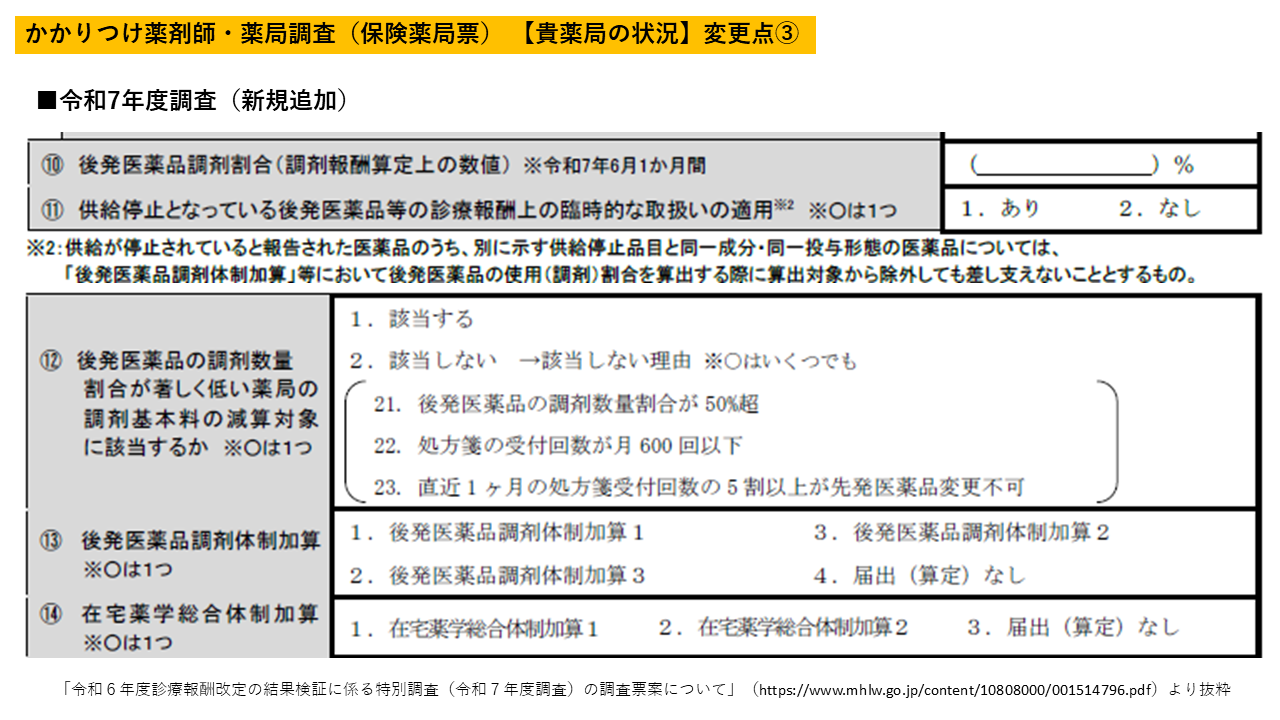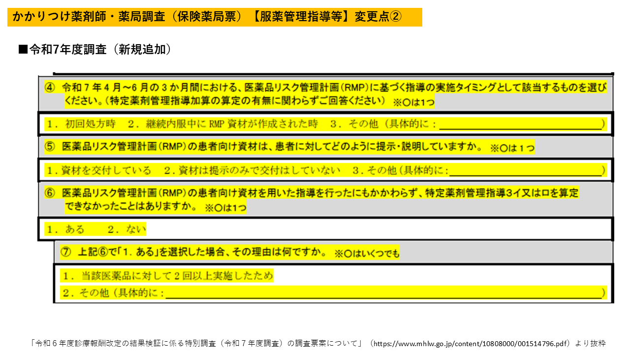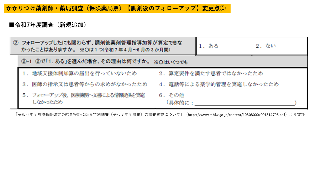 新たに「調剤後薬剤管理指導料」の算定状況や、算定できなかった理由を尋ねる設問が追加されました。
