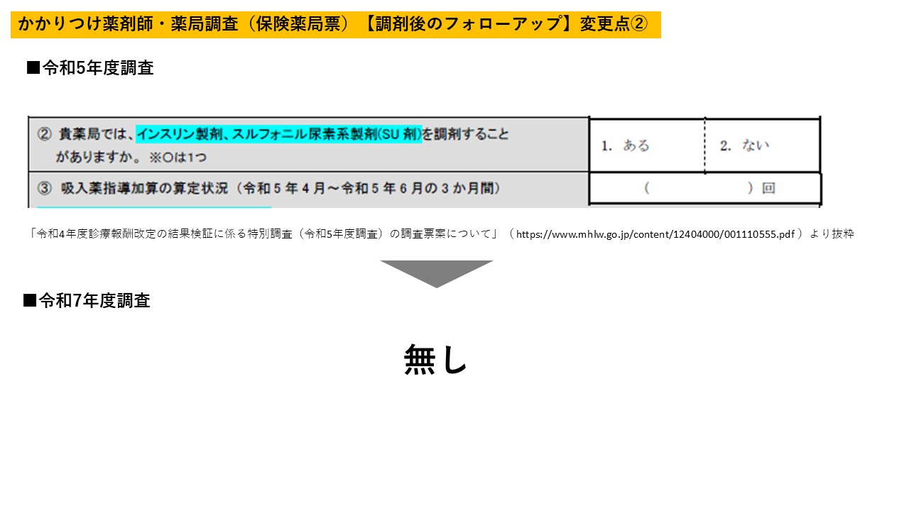 令和5年度調査では、薬局におけるインスリン製剤やスルホニル尿素系製剤(SU剤)の調剤有無を確認する設問、さらに吸入薬指導加算の算定状況を把握する設問が設けられていました。これらはいずれも、特定薬剤や特定加算の運用実態を把握することを目的としたものです。