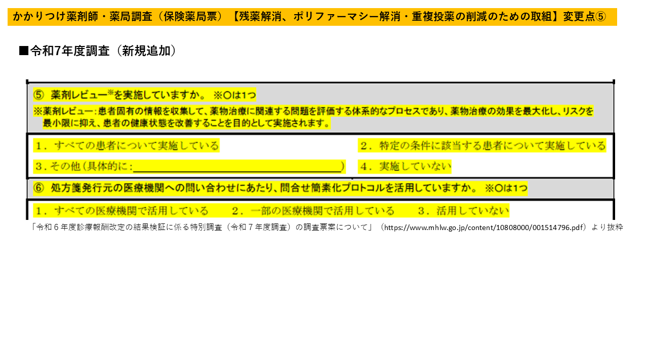 新たに薬剤レビューの実施状況を問う設問が追加されました。薬剤レビューとは、患者個別の情報を体系的に収集・評価し、薬物治療の有効性を最大化しつつ、副作用や重複投薬のリスクを最小限に抑えることを目的としたプロセスです。選択肢では、すべての患者への実施、特定条件患者のみ、その他、未実施の4区分で、現場の実施度を可視化します。