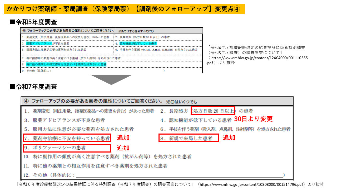 令和7年度調査では、フォローアップの必要がある患者属性に関して、選択肢の見直しと追加が行われています。まず、「長期処方」の定義が「処方日数30日以上」から「処方日数28日以上」に変更されました。これは、28日処方を長期処方として扱う動きに合わせた調整とみられます。