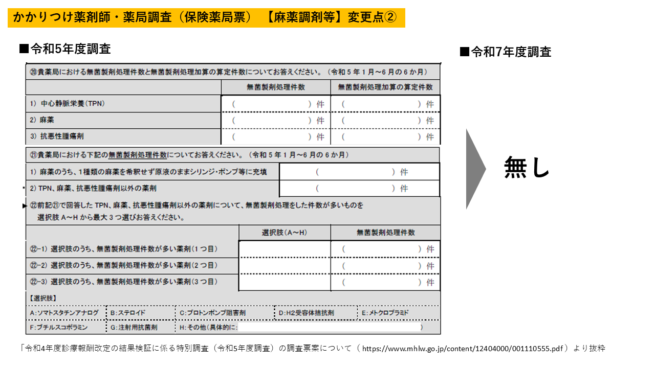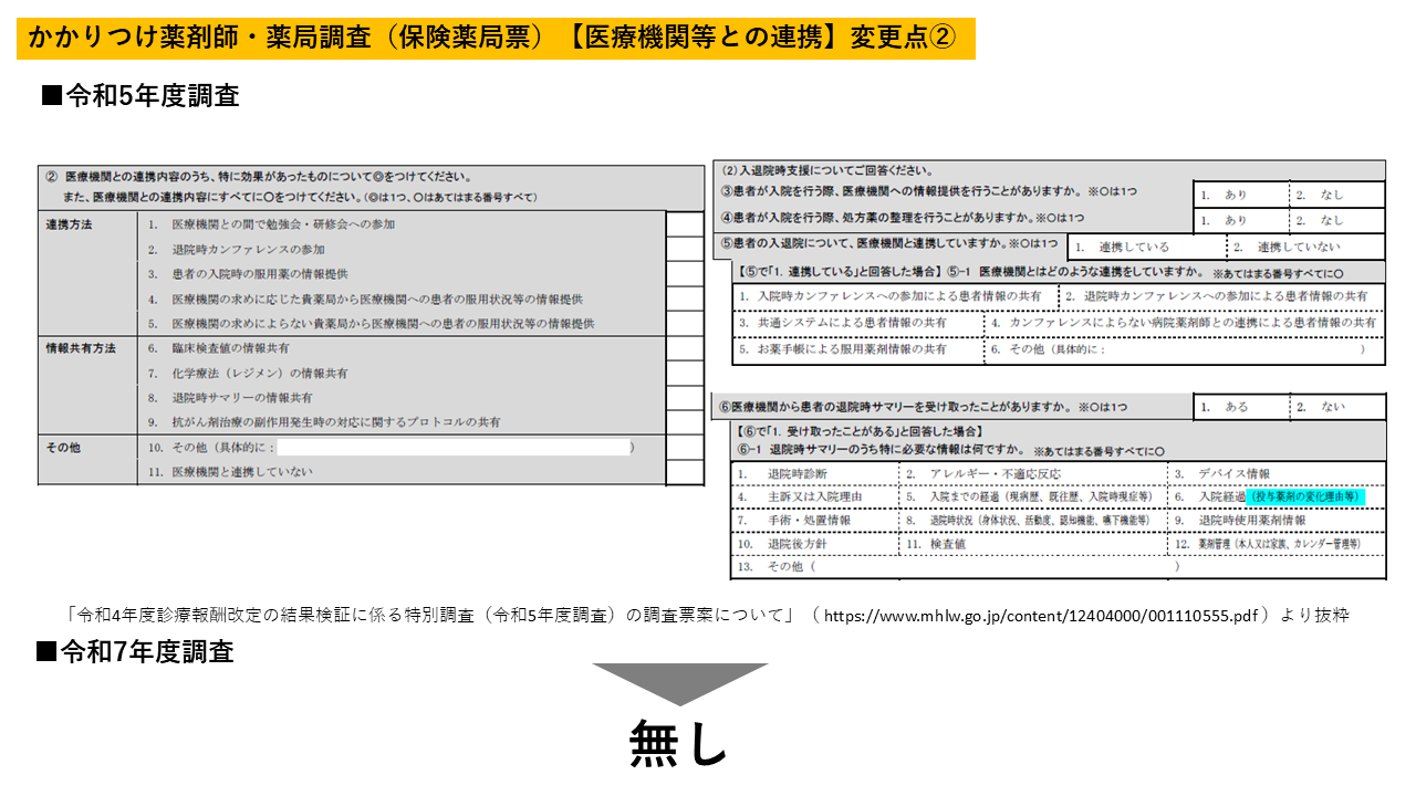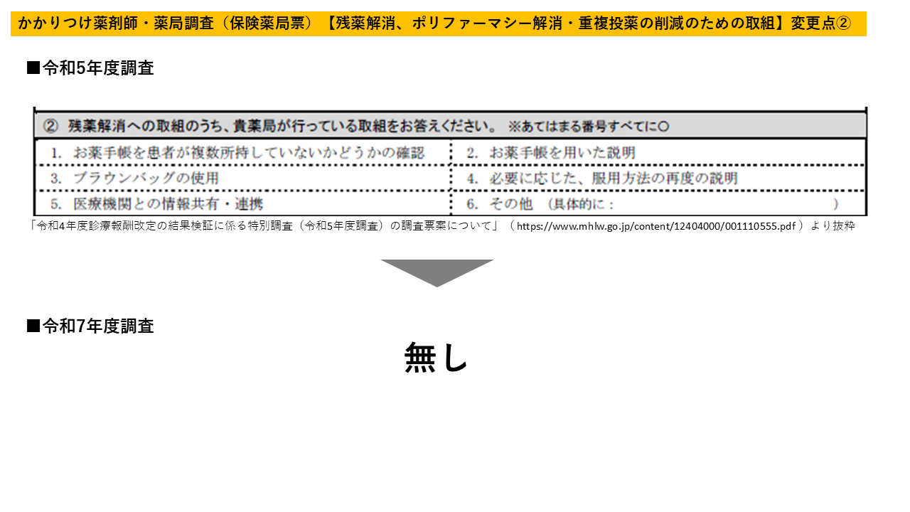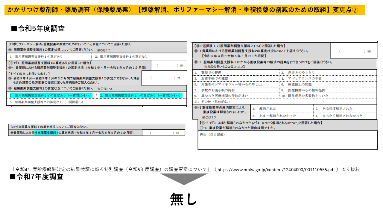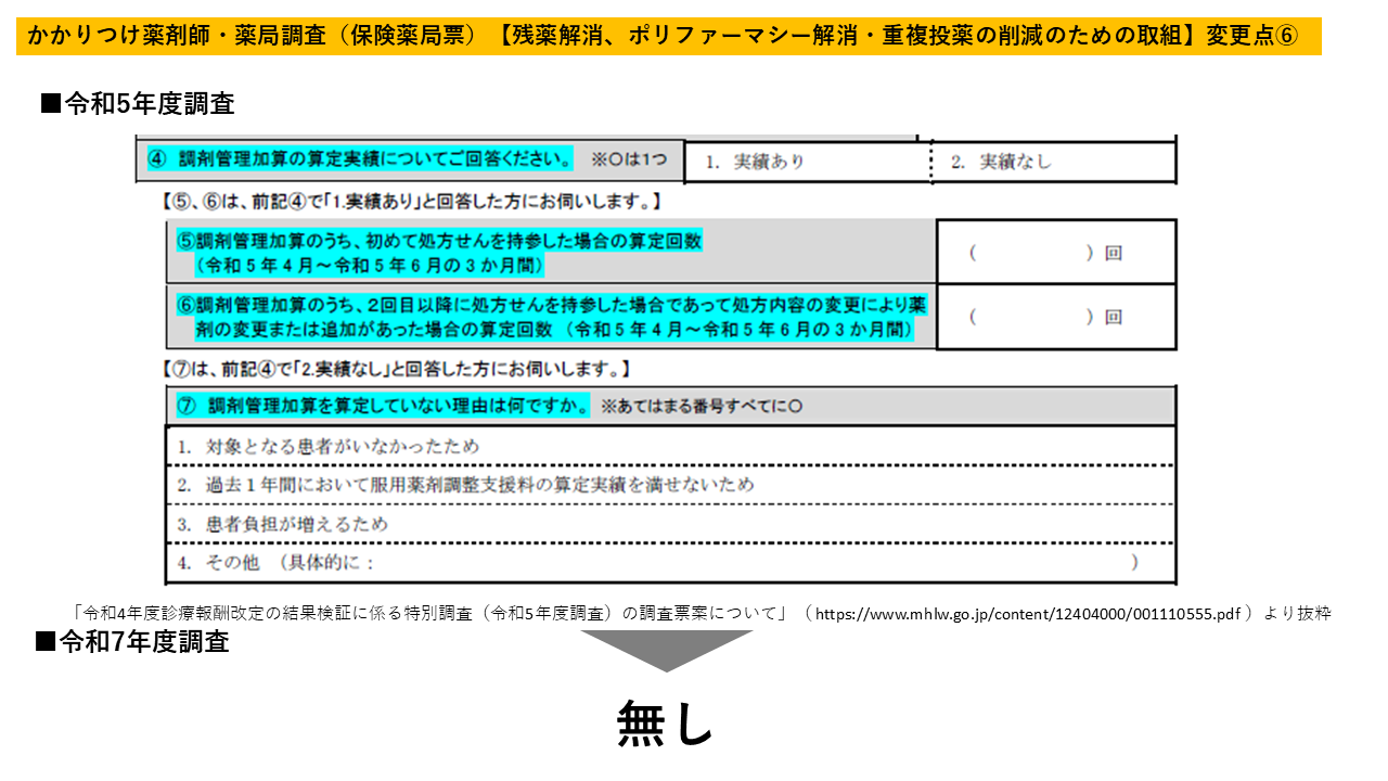 令和7年度調査では、令和5年度調査に存在した「調剤管理加算の算定実績」や「服用薬剤調整支援料1・2の算定状況」に関する設問がすべて削除されました。具体的には、初回または2回目以降の処方箋持参時における算定回数や、未実施理由を問う設問がなくなっています。