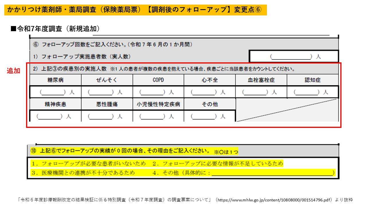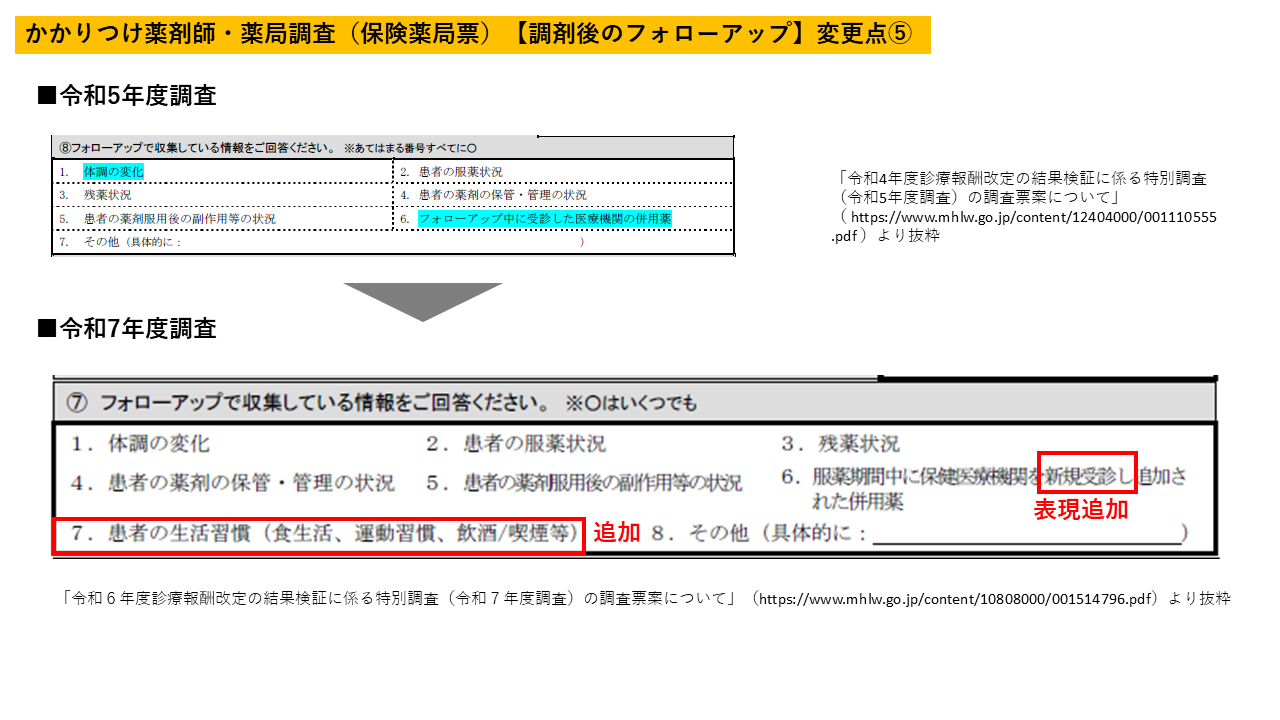 これらの変更により、フォローアップは単なる薬剤情報の確認にとどまらず、生活背景や新規受診の有無も含めた、多角的な患者評価を行う方向に進化していることが読み取れます。