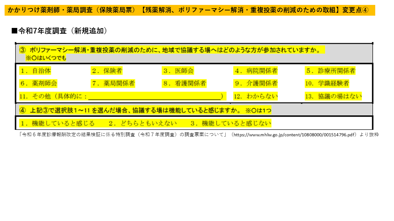 ポリファーマシー解消や重複投薬の削減に向けた地域での取り組み状況をより具体的に把握するため、「地域で協議する場合に、どのような関係者が参加しているか」を尋ねる設問が新設されました。自治体、保険者、医師会、病院・診療所関係者、薬剤師会、薬局関係者、介護・看護関係者、学識経験者など、幅広い関係者の関与状況を確認する内容となっています。
