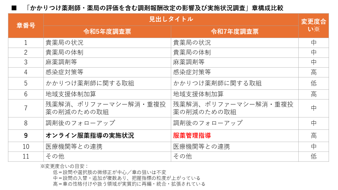 令和5年度調査では9章が独立して「オンライン服薬指導の実施状況」でしたが、令和7年度ではこれを独立章から外し、9章を「服薬管理指導等」に再編。一方、「かかりつけ薬剤師」の章立てと設問内容は両年度で大きな変更はありません。