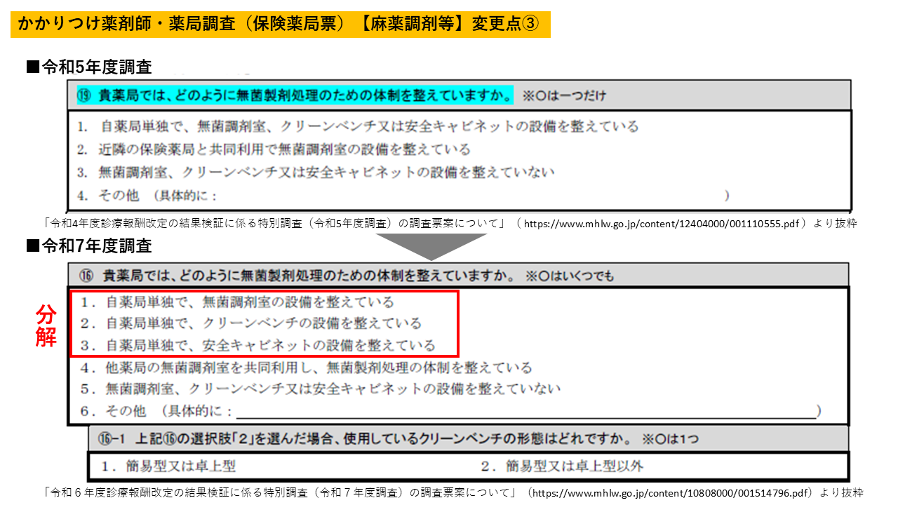 令和7年度調査では、無菌製剤処理の体制に関する設問が詳細化され、従来は一括されていた「無菌室、クリーンベンチ又は安全キャビネットの整備」が、それぞれ個別の選択肢として分解されました。これにより、薬局ごとの設備整備状況をより正確に把握できる構成になっています。