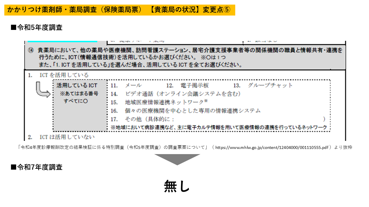 令和5年度調査では、薬局が最も多く処方箋を受け付けた医療機関について「診療所か病院か」「在宅療養支援の届出区分」を尋ねる設問や、他の薬局や医療機関、多職種との情報共有・連携で活用しているICTツール(メール、電子掲示板、地域医療情報連携ネットワーク等)を確認する設問がありました。