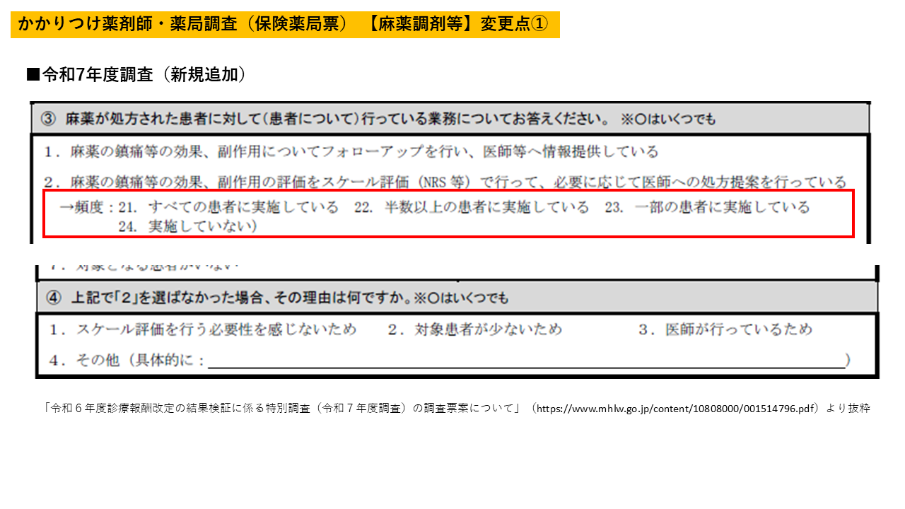 麻薬が処方された患者に対するスケール評価(NRS等)に関して、2つの変更が行われました。