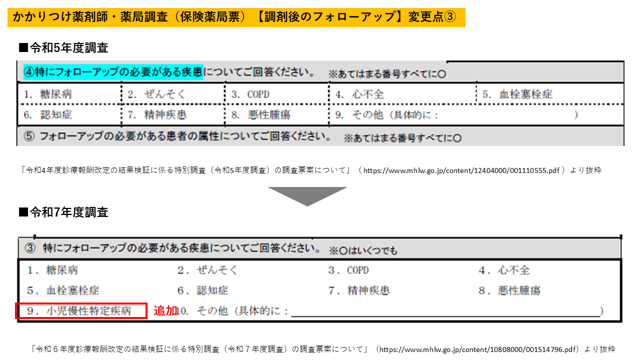 令和5年度調査では、特にフォローアップの必要性が高い疾患として、糖尿病、ぜんそく、COPD、心不全、血栓塞栓症、認知症、精神疾患、悪性腫瘍などが列挙されていました。令和7年度調査では、これらに加え「小児慢性特定疾病」が新たに選択肢として追加されています。