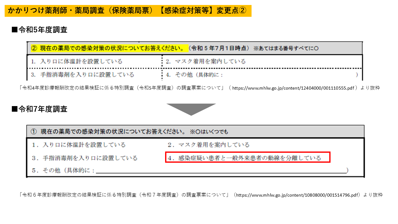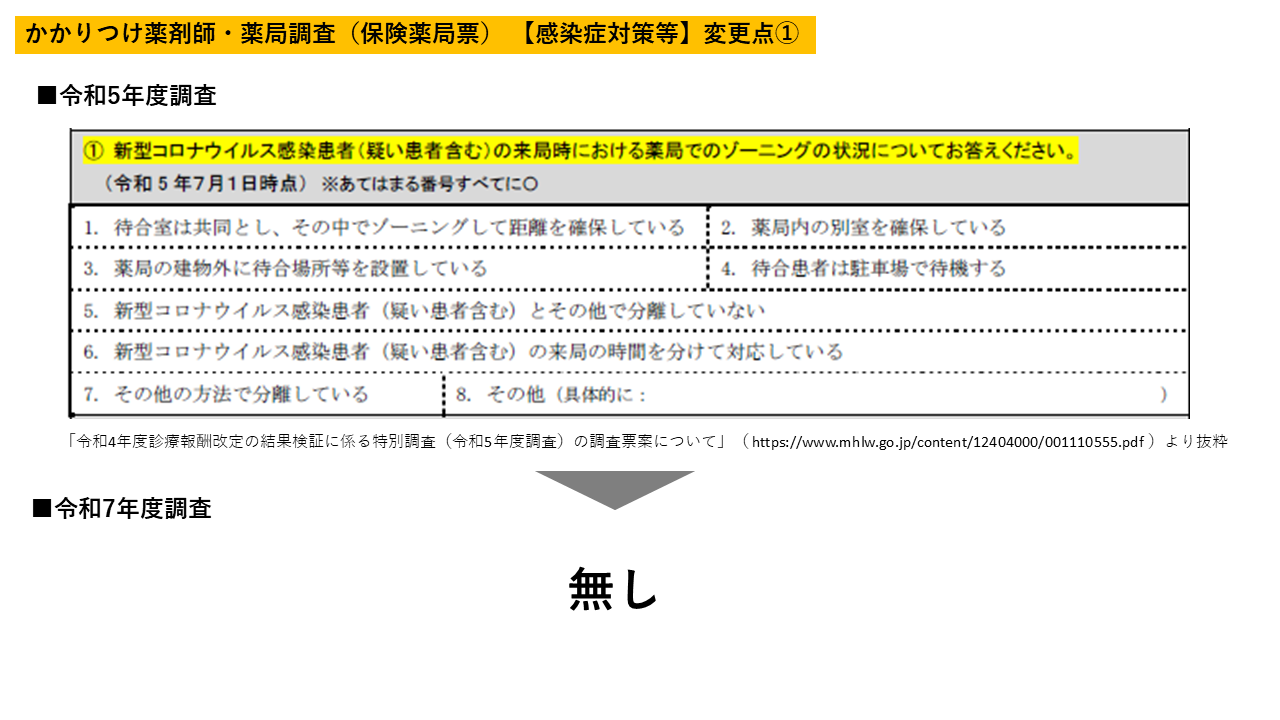 この変更は、感染症法上の新型コロナの位置づけ変更や、薬局現場での対応が平常運用へと移行したことを背景に、特定感染症として詳細なゾーニング状況を把握する必要性が薄れた可能性があります。今後は新型コロナに限らず、幅広い感染症リスクを想定した標準的な感染症対策の一環として動線分離を位置づけ、継続的な感染防止策の実施状況を把握する狙いがあると考えられます。